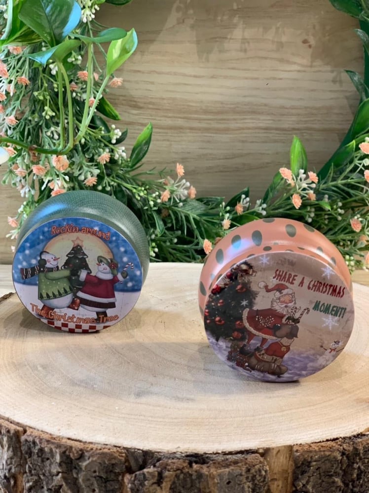 طقم من علبتين معدنية صغيرة متعددة الاستخدامات بنقشات شتوية مميزة. القطر 8 سم.